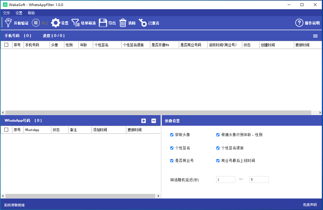 - 本软件为非官方检测工具,长时间大批量进行此操作会触发WhatsApp风控,请合理使用本软件